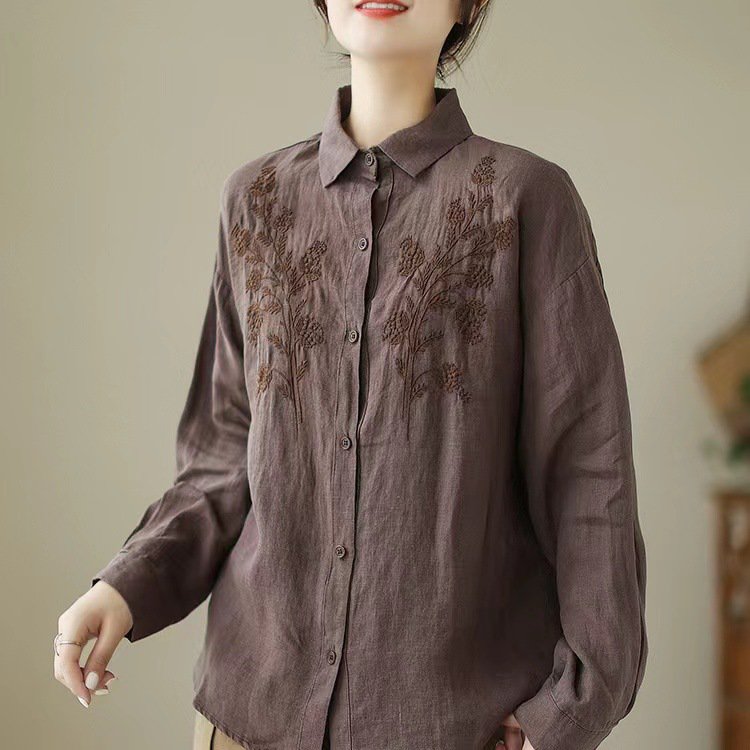文藝復古大碼棉麻長袖刺繡襯衫女